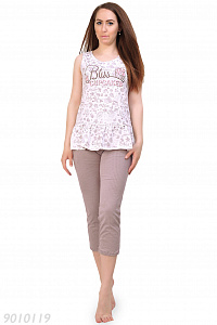 Пижама женская, без рукава, с округлым вырезом горловины. Майка с рюшей по низу, декорирована принтом. Бриджи прямые, без карманов. Рост модели на фото 164см.